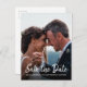Den här chicen sparar datumet för fotovykort med skript för elegant och modern typografi. Du kan enkelt anpassa det här spara datumkortet med din kommande information om bröllop och förlovningen. Fotofasaderna in i en chic svart färg. Om du behöver hjälp eller matchande artiklar kontaktar du oss genom vår butik! Vi är lycklig för att hjälpa dig att göra bröllop till den vackraste dagen.
