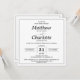 Skriptskript med bröllop, fysisk eller digital utskrivbar fyrkantig inbjudan till elegant, vit med svart text och delikat ram. Anpassa det till namn, efternamn, datum, plats, register och OSA. Baksidan kan anpassas med parets initialer.