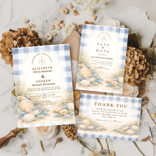 A refined coastal wedding design featuring an elegant oval wreath of seashells, oyster shells, starfish, and soft sea glass accents. Neutral sandy tones blend with muted ocean blues and delicate dune grasses to create a serene seaside aesthetic. The warm parchment background enhances the natural textures while maintaining a timeless, elevated feel. Perfect for a romantic beach celebration with classic coastal charm.