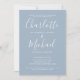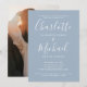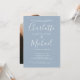 Med signaturstilnamn kan denna eleganta, moderna enkla inbjudan till förlovningsfest anpassas med din information i chic vit bokstavsgestaltning på en dammig blå bakgrund och foto på baksidan. Designad av Thisisnotme©
