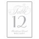 Varje kort för bordsnummer måste anpassas och läggas till individuellt i kundvagnen. Elegant silver grått färgad-design på vit bakgrund har ett vackert skript med ett bröllop monogram/bordsnummer som visas på båda sidor av kortet.