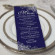 Den här vackra menyn kommer att lägga lite stil till ditt bröllopsmottagande. Den har en vacker design med ornat silver grått-faux-folie och snurrar på marin blå bakgrund. Det finns utrymme för namn från paret och bröllop, och texten är helt anpassade. Elegant, klass och glam, den här menyn kommer att lägga till en luft av sofistikering och ära till firande.