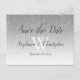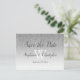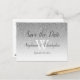 Den här chicen sparar vykortets datum med en bakgrundsbild av faux silver glitter. Orden "Spara datum", namnen på briden och trimmen, och datumet bröllop visas i elegant mörk grått handskriftsskript i stil med ett vitt monogramstecken i seriftypsnitt. Anpassa det omvända med din returadress och ytterligare information.