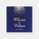 En modern elegant napkin-design med stänk i silver glitter på en djup royal blå bakgrund med namn av bruden och brudgummen i ett vackert handskrivet typsnitt. Du kan anpassa den genom att gå till menyn Anpassa. Detta är en del av en klassad bröllop-svit med många matchande delara.