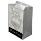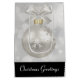 Giftväska med magisk helgdag. Med en silver-jul-boll med snöflingor-dekorationer och avslutat av med en söt silver-båge. Bakgrunden är en illustration av ljus vid silver med elegantens stjärnor spridda över hela världen.