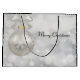 En stor presentväska med magisk helgdag. Med en silver-jul-boll med snöflingor-dekorationer och avslutat av med en söt silver-båge. Bakgrunden är en illustration av ljus vid silver med elegantens stjärnor spridda över hela världen.