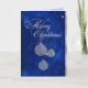 Kort för julhälsning i elegant, med silver-färgade prydnadsföremål i julklapp boll, mot mörk blått färgad, med snöflingor och gnistor. Silver-tonsgrafiktext, God jul och ett dekorativt silver-tonband, springa nedåt högerna kant på kortet. Anpassa texten till den kostym som helgdag behöver.