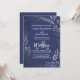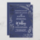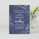 Detta eleganta silver- och marinblå bröllopsinbjudningskort med bladrik ram är perfekt för ett klassiskt bröllop. Designen har en fantastisk silvergrå bladrik ram på en mörkblå bakgrund och är parat med en strålande kursiv stil.