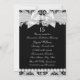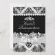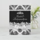 Silver & svart Quinceañera-inbjudan. Elegant damask-design med pärlsilkesbåge. Anpassa med dina egna detaljer. Observera: Alla platta bilder. De har inte riktiga band, spets eller juveler!