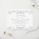 Elegant och glamourös, denna spara-datum-kort utan foto har glänsande silverglittrig damaskkant längst upp och nere på en krämvit bakgrund med matchande silvrig typografi. Den utsmyckade rullverket runtom ger det en formell, lyxig känsla som passar svarta-tie- eller vinterbröllop. All text är helt anpassningsbar.