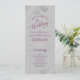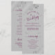 Detta vackra bröllopsprogram har en elegant design med cassis lila eller magenta text på en grå bakgrund och luftiga silvergrå falska foliekrullar och snirkel i hörnen. Titlarna är skrivna i fin kalligrafi med versal stil, och det finns utrymme för din ceremoni och bröllopsfest detaljer, samt ett kort tack till dina gäster. Underbar välkomst till dina vänner och familj på din bröllopsfest.