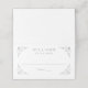 Ett sofistikerat bröllopskort med en utsmyckad silverrullram med känsliga blomsterornament på en ren vit bakgrund. Paret efternamn och bröllopsdatum visas i förfinad typografi inom den dekorativa ramen och skapar en polerad monogram mittpunkt. Namnet och datumet är lätta att anpassa. Gästnamn och bordstilldelningar skrivs för hand.