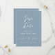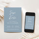 Our simple, elegant dusty blue save the date wedding invitation card with white calligraphy script is perfect for your stylish wedding celebration. A beautiful pairing of white calligraphy font with simple and clean text on a dusty blue background makes for an elevated look to complement your special day. Easy to customize yourself with your own names and wedding event details.
