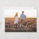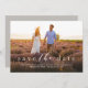 Spara datumet! Du är gifta sig! Du är upptagen och vill de stora nyheterna! Med enkel typografi, men med elegant, är det här sparandet av datumfotokortet en klassisk utformning som har ett enda vågrät. Den vita ordalydelsen placeras grund i ram tillsammans med ett mörkare filter för att möjliggöra bättre läsbarhet. Baksidan är en mjuk grått-beige med en subtil punkt mönster.