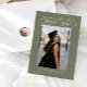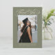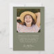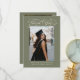 Trendig examens tacksamhetskort med examenfoto, elegant skript och utrymme för skolnamn och årskurs. Bakgrundsfärgen är sälggrön.