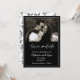 Det här eleganta vykortet med foto för save the date är perfekt för er som föredrar en minimalistisk look. Kortets design visar ert favoritfoto eller ert formella förlovningsfoto mot en svart bakgrund. Orden Save the Date och brudens och brudgummens namn är skrivna med en vacker, romantisk vit script-typografi. Resten är gjort i ett enkelt vitt typsnitt för att följa den minimalistiska tematiken. Uppdatera kortet med er information med hjälp av den lätta mallen som medföljer. Baksidan av kortet har ett elegant svartvitt blad-mönster.