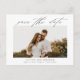 En elegant skript fotobryllop spar datum med horisontellt foto och minimal text. Klicka på redigera för att anpassa denna design.