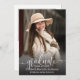 Elegant skript examen enkel fotobutiks examensmeddelande kort med skript teckensnitt full bleed porträtt foto på framsidan med namn och examensdetaljer. Baksidan har ett andra foto med ytterligare detaljer. Klicka på redigeringsknappen för att anpassa denna design.
