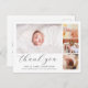 Det här tidlösa och stilrena födelsekortet och fototackkort är perfekt för alla som vill tacka sina gäster för presenter, kärlek och stöd på deras baby shower och presentera sin nya familjemedlem. Den moderna och eleganta designen har en minimalistisk stil och har fyra anpassningsbara foton i klistret, enkel elegant typografi för din information och ett snyggt skrivstil för en "tack"-rubrik. På baksidan finns ett anpassningsbart tackmeddelande med era namn. Använd knappen "anpassa" för att ersätta foton och redigera text.