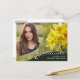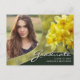 Ett unikt anpassat fotoexamen-kort med designelement av elegant handskriven stil med modern text. Examenkandidatens foto framhävs av vackra gula blommor på en skogsgrön bakgrund. Baksidan av kortet erbjuder personliga textfält för information om examen och framtida resa. För att se fler föremål som detta, besök min butik här på "www.Zazzle.com/LakeViewCardCo". Tack