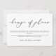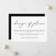 En enkel och elegant design för att meddela en ändring av era bröllopsplaner. Designen har en rubrik "ändring av planer" i svart modern kalligrafi, ert meddelande i svart sans serif-teckensnitt, på en vit bakgrund. Baksidan är i massivt svart.