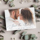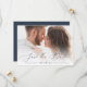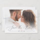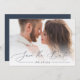 Anteckna att du i stil inte kan glömma bort bröllop-datumet med den här enkla fotot och fotofotot av elegant sparar datumkorten, med ett vågrät eller ett landskapsinriktat foto med fullt "spara datumet" som läggs över i ett marint blått kalligrafiskt skript som skrivs längs grund. Din namn, bröllop-datum och bröllop-plats visas under modern text. Anpassa baksidan med ytterligare information, t.ex. webbplatsen bröllop.