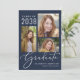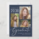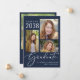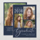 Modern blå examensmeddelande med en 3-foto collage och "Graduate" i ett elegant vitt skript. Lägg till examenens namn, klassår och skola eller universitet i enkel vit typografi. På baksidan, lägg till ett ytterligare foto och ditt personliga meddelande.