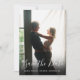 Detta enkla, moderna skriptfoto förhandsinbjudan har ditt speciella foto överlagt med ett skript förhandsinbjudan ovanför era namn, datum och lokal i vit text. Baksidan visar detaljer om er bröllopswebbplats och QR-kod. Designad av Thisisnotme©