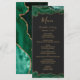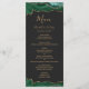 Denna eleganta, moderna bröllopsmenyn har övre och nedre kanter i smaragdgrön akvarellagat med guld falskt glitter. Texten visas i elegant guldfärgad handskrift, kursiv och kopparstick-font på en skiffer svart bakgrund. Agat-designen upprepas på baksidan.