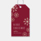 En elegant julklappsetikett av Stacey Meacham med spridda metalliska fallande snöflingor på en bakgrund i ädelstensfärg.