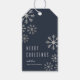 En elegant julklappsetikett av Stacey Meacham med spridda metalliska fallande snöflingor på en bakgrund i ädelstensfärg.