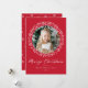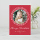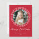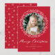 Elegant helgdag kort med foto omgivet av en andedräkt av snöflingor och vitt gräs grenar på en festive red bakgrund. "God jul" visas i ett fet, vitt kalligrafiskript med ditt namn och året som visas nedan. Baksidan av det moderna helgdag-kortet har en vacker snöflinga mönster.