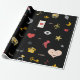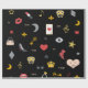 Cute-design som representerar emoji bilder av uggla, läppar, hjärta, kisser, skor, anteckningar, stjärnor, krona, kort, ringar, nycklar och ord på svart bakgrund. Emoji bilder från emojione.com. Du kan anpassa färg i bakgrunden.