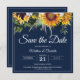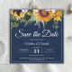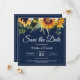 Elegant marinblått och solblommor bröllop spara datum. Anpassa den med en QR-kod på baksidan som dina gäster kan söka igenom för att enkelt öppna webbplatsen för bröllop.