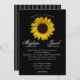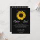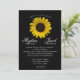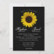Elegant och vacker inbjudan till blommigtens trädgårdsbröllop med fotografi av en fet gult solros och två svarta rand på baksidan av kortet.