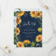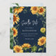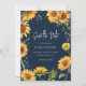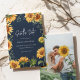 Elegant Solroskort för hösten Bröllop spara datum. Utformningen har en trendig marin blå bakgrund med solrosfärgade blommigtar under sommarsommaren och en grönare ram för en modern mall som har varit designad med hjälp av ett vitt kalligrafiskt skript och serif typsnitt. Par har också möjlighet att ladda upp ett foto av sig själva på motsatt sida.