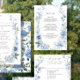 BRÖLLOPSDetaljer. Elegant, vildblomsinspirerad inbjudan med svala pastellblå blommor i en lös akvarellkrans med dammig blå färg och inslag av marinblått och svala, dämpade bladverk i grönska på vit bakgrund. Baksidan har en QR-kod och ett fält för mall för bröllopswebbplats som du kan ta bort om det inte behövs. En komplett uppsättning produkter finns tillgängliga för köp i kollektionen. MSP0103