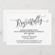Denna svits utmärkande beror på den utarbetade, virvlande skrivstil som används för accentfraser. Om du behöver låta dina gäster veta att ditt bröllop har ställts in, ger detta kort ett elegant alternativ. I denna del användes den kalligrafiska teckensnittet för att skapa en grafik som visar ordet "Regretfully". Använd mallfälten för att lägga till dina personliga uppgifter och gör denna design till din egen. Bakgrunden kan ändras till valfri färg du föredrar. Vänligen hör av dig med eventuella specialförfrågningar eller för anpassningshjälp. // 98 //