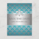Elegant bröllopsdesign "Spara datum" med romantisk Fleur De Lis Blå, och anpassade namn och datumtext. Imponera på familj och vänner med denna stilrena och moderna design. Helt anpassningsbar! Lätt att använda och lätt att anpassa. Beställ idag!