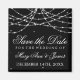 Elegant bröllop "Spara datum"-design med mousserande strängssvart, anpassade namn och datumtext.