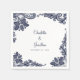 Elegant romantisk spetsförlovningsbröllop, förlovning eller årsdag event fest servett design har en krispig vit bakgrund med utsmyckad marinblå falsk spets i alla hörn centrerad runt parets förnamn och speciella datum. Anpassa designen med dina detaljer i trendig bokstavsstil och handskrift i trendig mörk marinblå. För bästa resultat, ersätt malldetaljer med dina egna detaljer och lämna utrymme mellan stycken som i exemplet. E-posta invitationsuites@gmail.com med frågor eller anpassade färgförfrågningar.