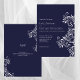 Bröllopsinbjudan till marinen Stil i marinen och vit Elegant designad med vit dekorativ accent på marinbakgrunden, framsidan och baksidan. Texten på omslaget till inbjudan innehåller: Namn, datum, tid, plats och mottagningsanteckning för Bride och Groom. Den omvända texten innehåller: OSA och OSA Information. Om du vill anpassa dig infogar du bara texten i vår enkla mall och ersätter exemplet. Se till att du kan se hela insamlingen för marin och vit Elegant Stil Bröllop för matchande kort och tillbehör.