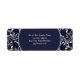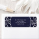 En adressetikett för Elegant Navy and White Bröllop Return, Sticker, designad med snyggt white dekorative gräns trim på en marin bakgrund med vit text. Om du vill anpassa dig infogar du bara Namn och Adress i vår enkla mall och ersätter exempeltexten. Se till att du ser hela insamlingen av marin och vit Elegant Stil Bröllop.