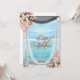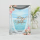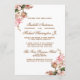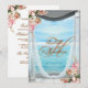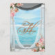 Havet sett från en elegant terrass med genomskinliga draperingsgardiner inramade av exotiska rosa orkidéer. Monogrammet och namnen är i elegant kalligrafi, texten är modern, samtida typografi. Kopparfärgad text ger en sofistikerad touch till denna vackra strandbröllopsinbjudan.