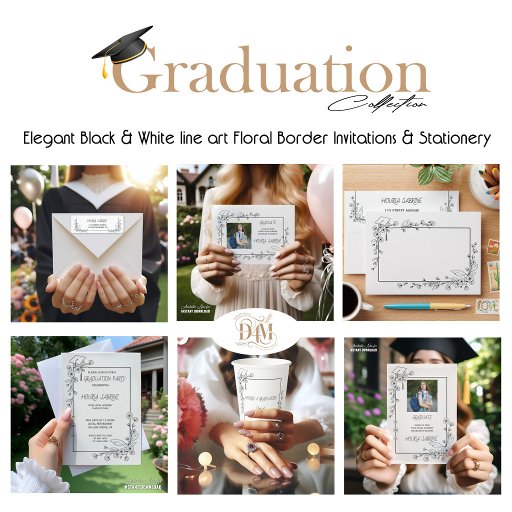 Inbjudan till elegant Studenten Black and white Blommigt Gräns. Den här inbjudan till anpassningsbar för personlig med en delikat snyggt svart och vit kontur teckning som illustrerar en snyggt enkel blommigt gräns som dekoreras med student-överdrag och trendig handskrivet manustypografi. Du kan personlig den här inbjudan: med designändringar eller anpassning, textändringar, storleksändring, överföring av designen till en annan produkt.