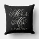 En elegant svart kastkudde med Mr. och Mrs. i flytande vit kalligrafi skrift med ett anpassningsbart familjenamn. Den djärva svart-vita kontrasten ger en dramatisk, modern bröllopsgåva eller slående nyhemma inredningsdetalj. All text är fullt redigerbar för att anpassa med parets namn.