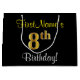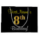 Den här enkla presentsäcksdesignen i eleganten innehåller ett personlig som "FirstName's 8th Birthday!" (med "8th" som har ett utseende som liknar guld i utseende) på en svart färgad. Namn är i skriptliknande gult-färgad och kan vara personlig. En sådan här personlig-födelsedagspressning skulle kanske kunna användas när en present eller gåva till någon som firar sin åttonde födelsedag är ge. [~Z0000258]