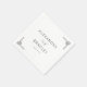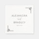 Denna servett för bröllop har en minimalistisk och elegant design med en ren vit bakgrund. Layouten inkluderar fet, versal serif-typografi för namnen, kompletterad med ett kursivt skrivsätt för "och", vilket skapar en sofistikerad kontrast. Dekorativa geometriska element i hörnen lägger till subtilt visuellt intresse utan att överväldiga den centrala texten. Den monokroma färgpaletten i svart på vitt betonar klarhet och modernitet, vilket gör den perfekt för formella tillfällen som firar enkelhet och elegans.
