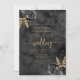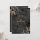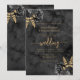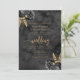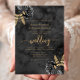 Denna eleganta bröllopsinbjudan har svarta blomsterbuketter som kontrasteras med falskt guldblad i två hörn, på en bakgrundsbild av svart vattenfärg. Den anpassningsbara guldfärgade texten kombinerar serif-, kursiv- och handskriftsfonter. Baksidan har en matchande svart och guld blommig och vattenfärgsdesign.