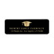 Elegant svart examens returadressetikett med en guld examensmössa och examenens namn och adress i modern guldtypografi.